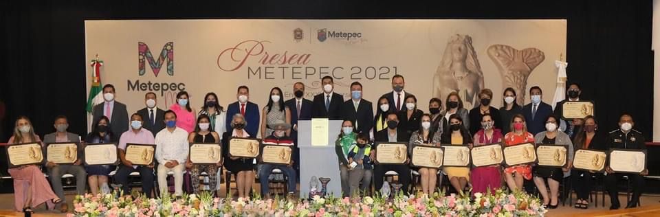 El momento cumbre de la ceremonia, fue la entrega de la Presea Metepec 2021, otorgada bajo el reconocimiento respectivo, a las siguientes personalidades: Mérito de Ciencia y Tecnología, Cinasalto (CBTIS 203); Mérito de Artes y Letras, Margarita Enríquez Sánchez, Blanca Leonor Ocampo Bodadilla; Mérito de Artesanías, Elsa Mondragón Cruz, Olga Lidia Díaz González y Teobaldo Marcial Hernández Cajero; Mérito de Deportes, Vanessa Yosune Velázquez Castrejón y Anahí Salas Almaraz; Mérito del Periodismo e Información, Alejandra Alarcón Ramírez; Mérito Municipal, Eugenia Morán Ríos; Mérito a la Juventud, Pablo Durán López; Mérito del Desarrollo Sustentable, Mayra Griselda Kuri Muñoz; Mérito Productivo de Campo, Tomás Escalona Rodríguez y Mauricio Jiménez López; Mérito Social, María de la Luz González Mejía; Mérito al Valor, Ricardo Maya Ramírez y Guillermo Rodríguez Valdés; Mérito a la Igualdad de Género, el Centro de Estudios Estratégicos e Investigación Social A.C. (CEEIS), y el Mérito a la Administración Pública, fue para Pilar del Consuelo Fernández Contreras.