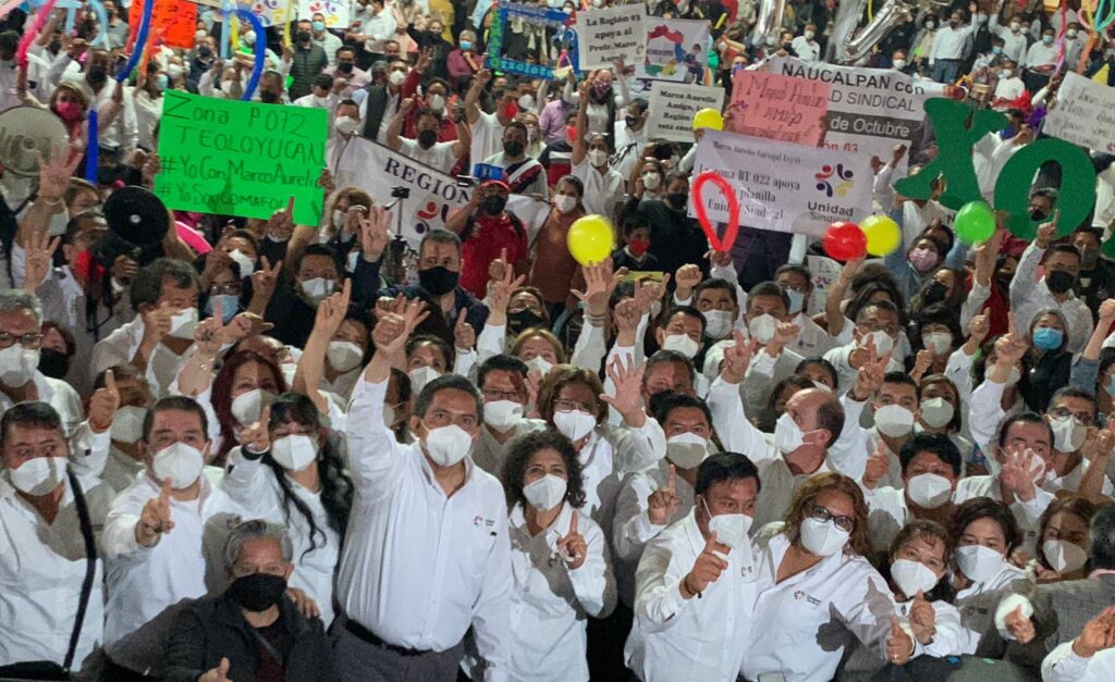 21 de octubre de 2021 Toluca, Estado de México.- La planilla Unidad Sindical, encabezada por Marco Aurelio Carbajal Leyva, candidato a Secretario General del Sindicato de Maestros al Servicio del Estado de México cerró campaña en la capital de la entidad, con el respaldo de unos 2 mil docentes que se dieron cita en el evento.