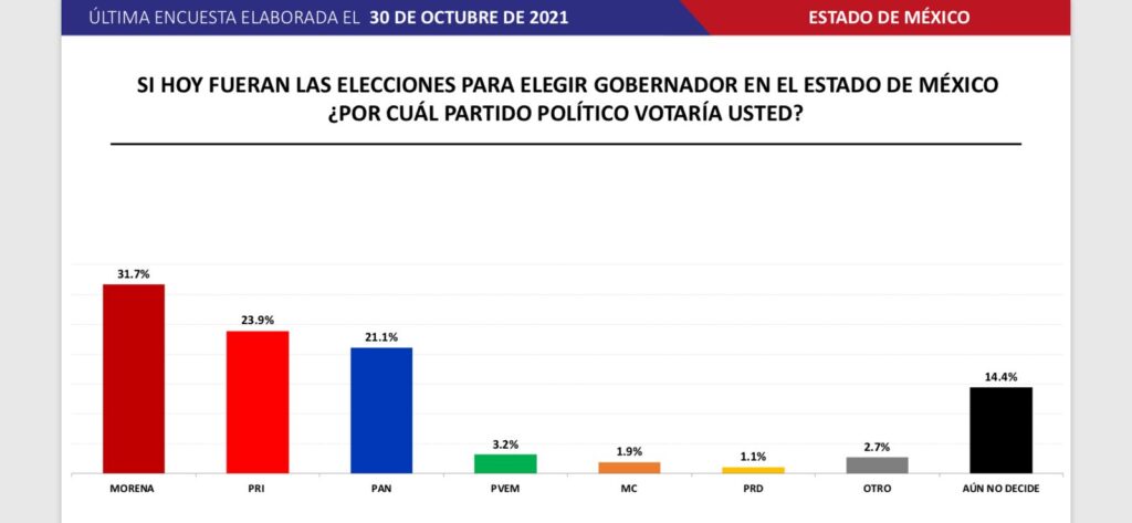 De acuerdo a los sondeos establecidos Morena lleva una preferencia de casi el 32 por ciento de los encuestados, mientras que PRI llega cerca del 24 por ciento y 21 por ciento del PAN.