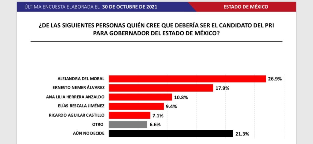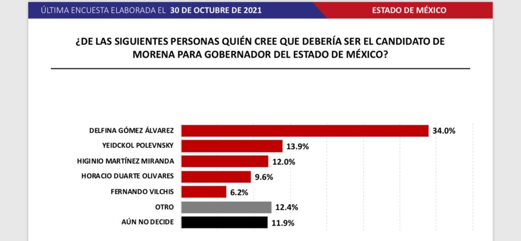 De acuerdo a esta empresa encuestadora, los perfiles más avanzados dentro de sus partidos políticos son Delfina Gómez, Alejandra del Moral y Enrique Vargas.