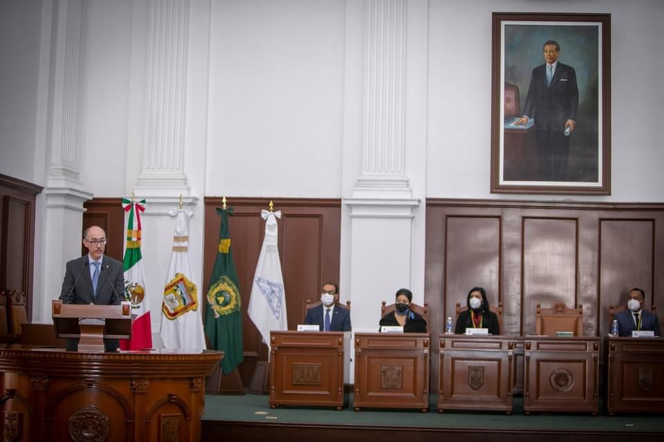 Toluca, Méx; 07 de diciembre de 2021. El rector de la Universidad Autónoma del Estado de México (UAEM), Carlos Eduardo Barrera Díaz, encabezó la ceremonia de Entrega de Notas al Servicio Universitario y Cumplimiento Administrativo, durante la cual se galardonó a 75 trabajadoras y trabajadores administrativos sindicalizados y de confianza, por contribuir a generar una institución más productiva, inclusiva y sustentable, laborando con responsabilidad, ética y creatividad.