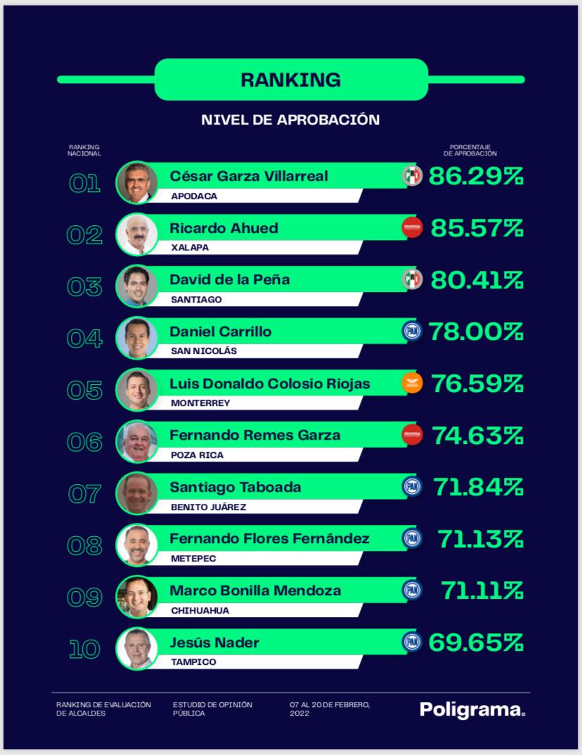 La casa de encuestas Poligrama, ubicó al alcalde de Metepec, Fernando Flores Fernández, en el octavo lugar a nivel nacional, con el 71.13% de aprobación entre los alcaldes del país.